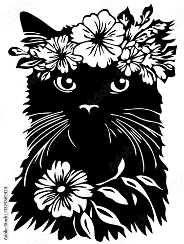 © Kiss, Fototapeta premium Floral Cat Silhouette Illustration for Creative Art and Tattoo Design