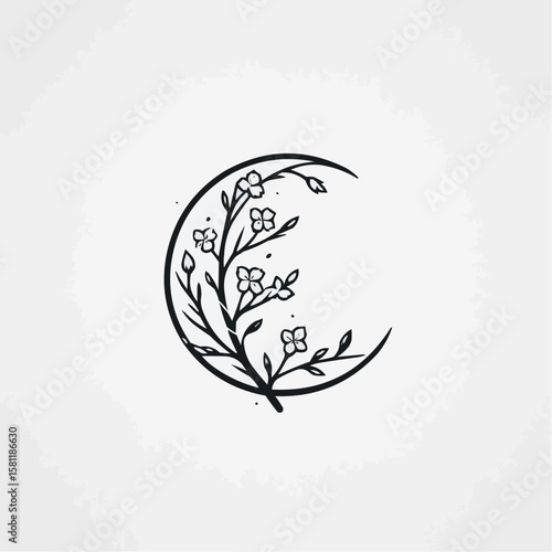 © Nata, Fototapeta premium Floral crescent moon drawing with delicate flowers and leaves on white background
