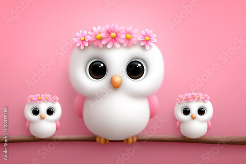 © Sung Hwan Kim, Obraz premium floral crown cartoon owls cute wallpaper