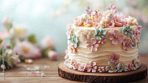 © Helois, Fototapeta premium Floral decorated cake on wooden stand.