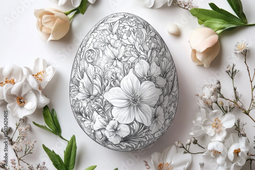 Fototapeta premium Floral easter egg drawing surrounded by white and peach flowers