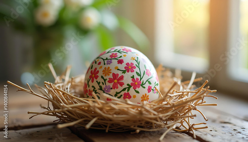 Fototapeta premium Floral Easter Egg in a Nest by Sunny Window