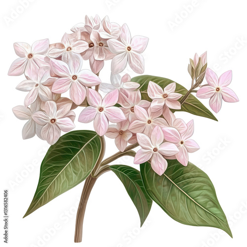 Fototapeta premium Floral Elegance: Exquisite depiction of delicate, star-shaped pink blossoms clustered on a gracefully curved stem adorned with verdant leaves