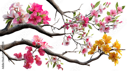 Fototapeta premium Floral Flourish: A detailed depiction of branches adorned with a variety of vibrant, blossoming flowers, artfully arranged to celebrate the essence of springtime.