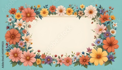 © Mirza, Obraz premium Floral Frame on Teal Background – Landscape Blank Template with Colorful Flowers