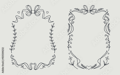 © herdesignstudio, Naklejka premium Floral frame set vintage style with ribbon bow and love element. line art style.