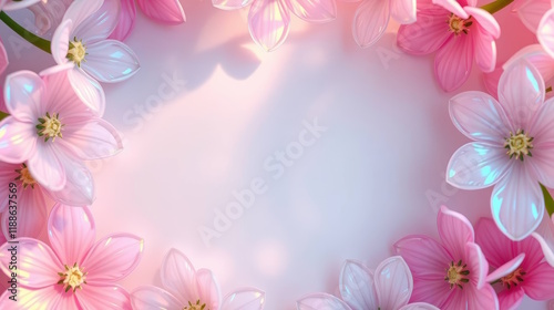 © DALITALI , Fototapeta premium Floral frame with flowers shimmering holographic glares on pastel background, greeting cards, advertising, promotions, flower shops, events, Copy space.