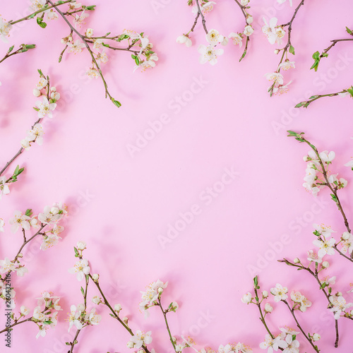 Obraz premium Floral frame with spring flowers on pink background. Flat lay, top view