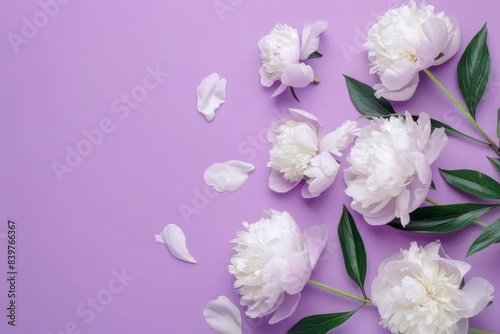 © Tiana_Geo, Fototapeta premium Floral frame with white peonies on beige stone background for wedding, Mothers day, Womans day card. Flower composition with place for text, copy space. Flat lay, top view