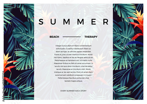 © Ms.Moloko, Naklejka premium Floral horizontal postcard design with guzmania flowers, monstera and royal palm leaves. Exotic hawaiian vector background.