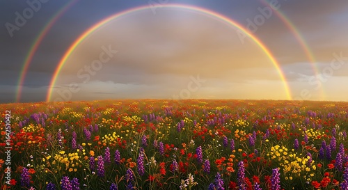 Naklejka premium Floral Meadow Under a Double Rainbow, Hopeful Horizon