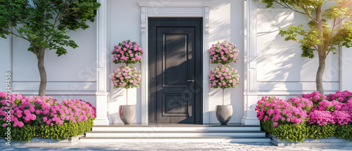 © Inai, Fototapeta premium Floral mockup with doorway. Front door, entrance, decorated peonies flowers. Home exterior, patio, backyard in a modern villa, penthouse. Facade of a modern house Generative ai