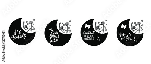 © Elena, Fototapeta premium Floral moons set. Celestial boho wildflowers. Magic wild flowers dandelion, daisy, chamomile with butterfly. Silhouette bohemian vector illustration for shirt design. Boho clipart.