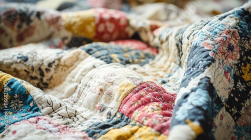 Fototapeta premium Floral Patchwork Fabric Close Up Showcasing Expert Textile Techniques in...