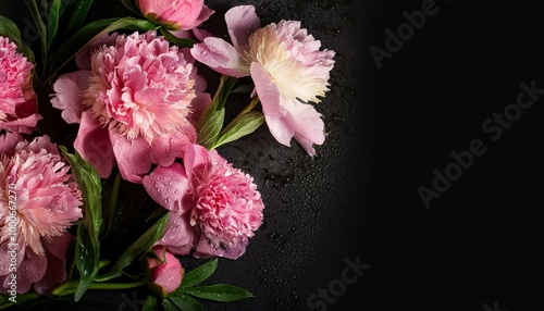 Fototapeta premium floral peonies lush after rain; with black textured space in center for text