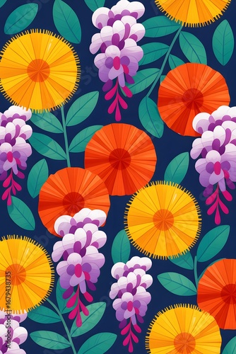 Naklejka premium Floral Rhapsody: A vibrant graphic of meticulously crafted flowers, showcasing intricate petals, and delicate blossoms arranged in a harmonious array of floral elements.