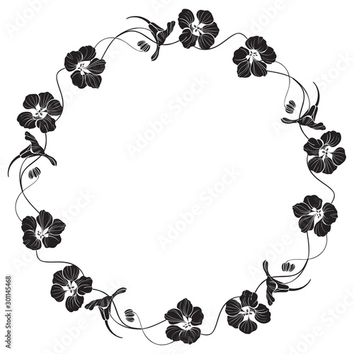 © maritime_m, Fototapeta premium Floral round frame with nasturtium and space for text. Vector illustration on white. Invitation, greeting card or an element for your design. Silhouette.