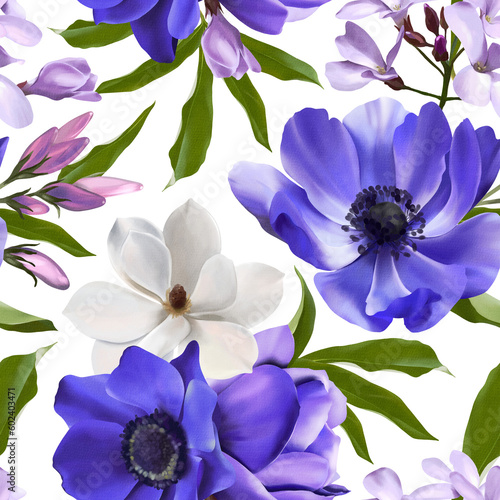 © Olga.And.Design, Fototapeta premium Floral seamless pattern on transparent background. Watercolor illustration with garden white, lilac wild flowers, tropical leaf. Botanic Template design for print, interior, invitation, wallpaper