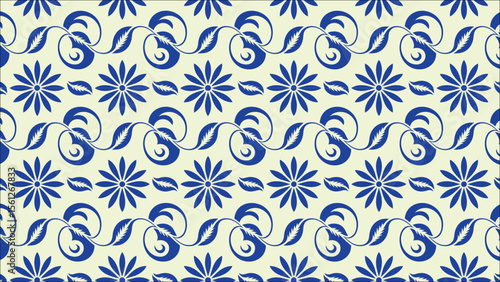 © Zee, Fototapeta premium Floral seamless pattern with blue decorative flowers and swirls on light background