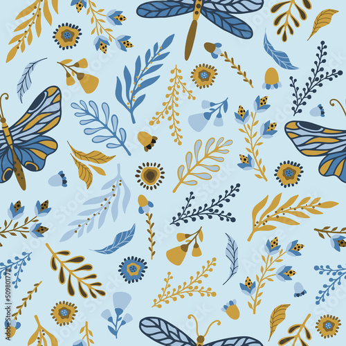 Obraz premium Floral seamless pattern with butterflies, hand drawn elements, vector design