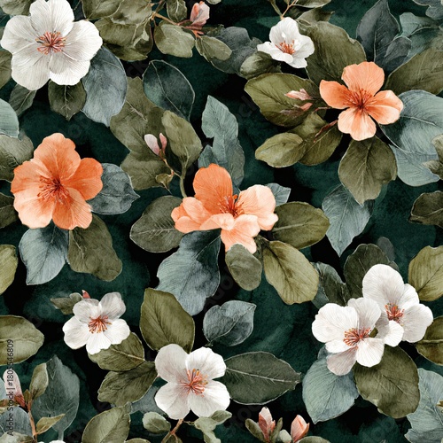 © Margarita Ratatosk, Naklejka premium Floral seamless pattern with white and orange flowers and green leaves. Botanical background for fabric, wallpaper, packaging design.