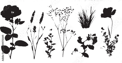 © Good moose, Naklejka premium Floral silhouette illustration featuring various plants in black against a white background. This vector set provides modern decorative elements.