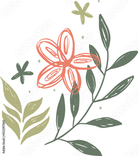 Obraz premium Floral sketch is showing coral flower, olive branches, green blooms, dots on...