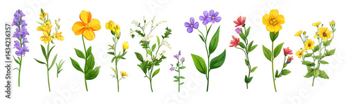 © TheseusStock, Naklejka premium Floral spring elements, a floral clipart set with various flowers and leaves in a flat vector style on a white background.