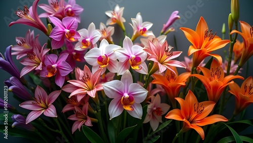 Fototapeta premium Floral Still Life with Colorful Lilies and Orchids in Full Bloom with soft...