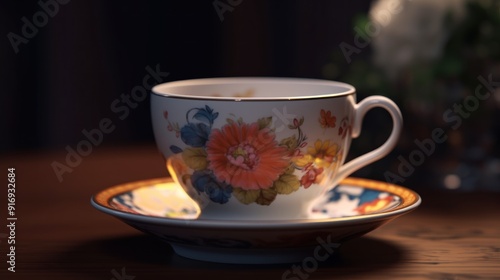© Egriva, Fototapeta premium Floral Teacup on a Wooden Table