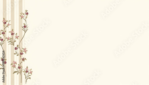 © Erik, Obraz premium Floral Vine Pattern on Striped Beige Background with Empty Space