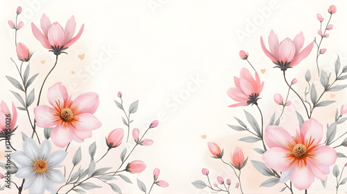 Fototapeta premium Floral Watercolor Border with Pink and Gray Flowers for Spring