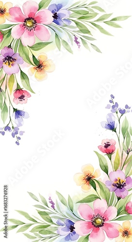 © Suroto, Naklejka premium Floral watercolor frame with pink, purple, and yellow blossoms arrangement