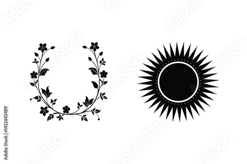 Fototapeta premium Floral Wreath And Sun Symbol Isolated Vector Illustration Black And White