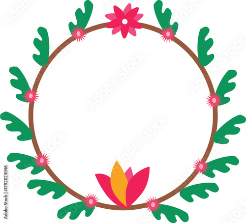 © Rabin, Fototapeta premium Floral wreath border frame decoration with green leaves and pink flowers vector illustration pattern design