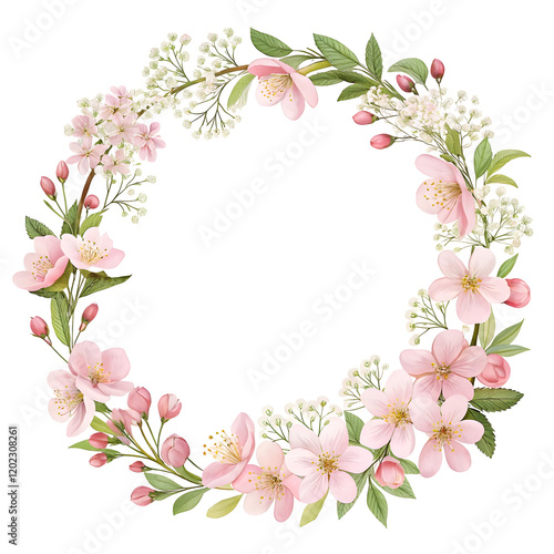 Fototapeta premium Floral Wreath: Delicate pink blossoms and white flowers arranged in a...