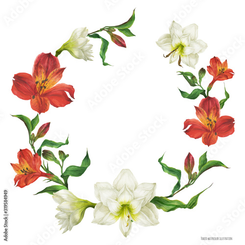 © Xenia Snowstorm, Naklejka premium Floral wreath with red and white lily flowers
