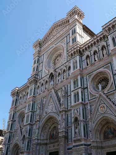 Fototapeta premium Florence Cathedral Duomo di Firenze with Brunelleschi’s dome and the Baptistery. exterior features intricate marble patterns in green, white, and pink, representing iconic Renaissance architecture