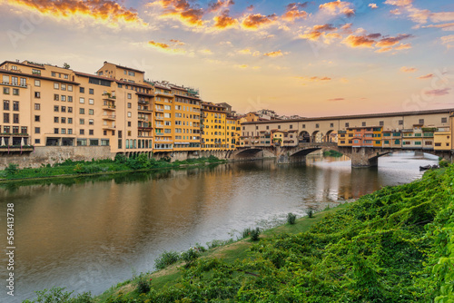© Noppasinw, Obraz premium Florence Italy, sunset city skyline at Ponte Vecchio Bridge and Arno River, Tuscany Italy