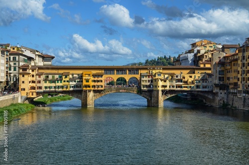 © Massimo Parisi, Obraz premium Florence, Pontevecchio, Tuscany, Italy August 27, 2014 Arno river. Blue sky with soft white summer clouds.