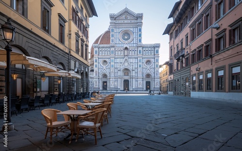 © StudioBackground, Obraz premium Florence's Historic Piazza, Empty cafe street facing Florence cathedral at dawn.