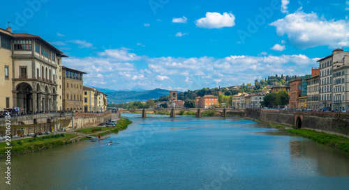 Obraz premium Florence, Tuscany / Italy: River Arno seen from Ponte Vecchio with the Uffizi...