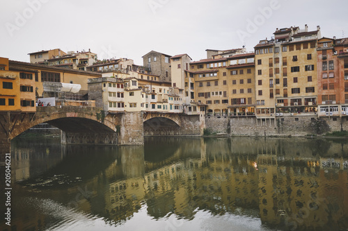 Naklejka premium Florencja, Włochy. Widok na Złoty Most i stare domy na nabrzeżu rzeki Arno. Pochmurne niebo. Domy odbijają się w wodzie.