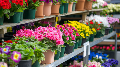Fototapeta premium Flores coloridas em vasos dispostas em prateleiras de jardim