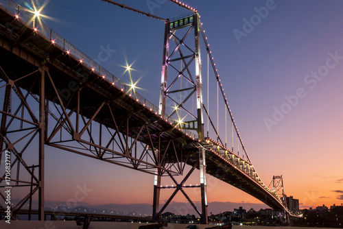 © Fotos GE, Fototapeta premium Florianópolis e o anoitecer na ponte Hercilio Luz com sua nova iluminação Florianopolis Santa Catarina Brasil