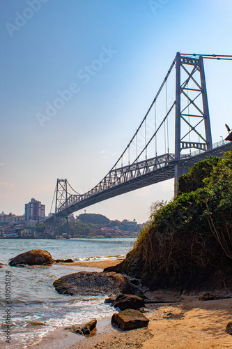 Fototapeta premium Florianopolis é praia, sol e mar e a Ponte Hercílio Luz, Florianópolis,,...