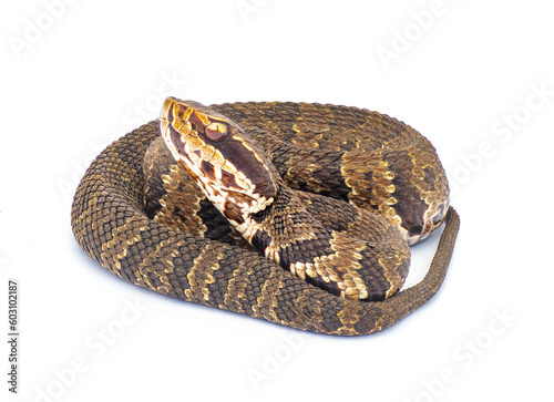 Obraz premium Florida cottonmouth snake - Agkistrodon conanti - a species of venomous snake, a pit viper. coiled in defense posture with mouth open. isolated on white background Coiled side profile view of head
