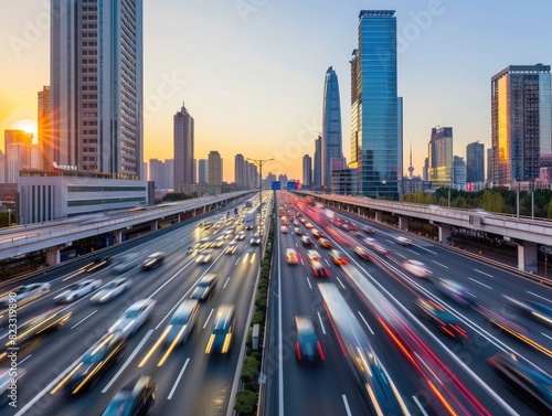 © piai, Fototapeta premium Flow of traffic on a evening highway in a city with modern high buildings