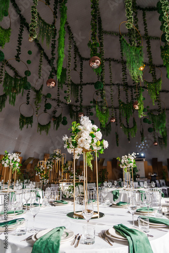 © andrey, Obraz premium flower arrangements, empty glasses, plates with green napkins on a table.