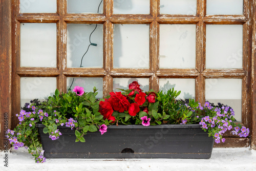 Fototapeta premium Flower bed on a old style wooden frame window. Red and purple flowers. House exterior decoration.